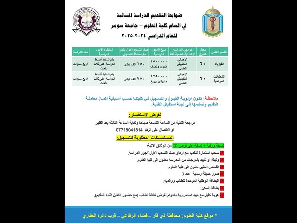 أعلنت وزارة التعليم العالي والبحث العلمي، عبر دائرة الدراسات والتخطيط والمتابعة/ القبول المركزي، عن بدء التقديم إلى الدراسة المسائية في الكليات والمعاهد الحكومية ابتداءً من يوم الأربعاء الموافق 1/10/2025 ولغاية 31/10/2025.